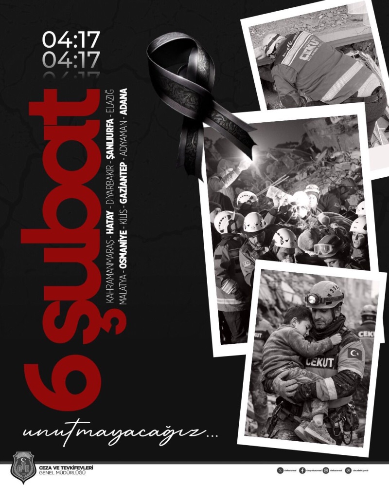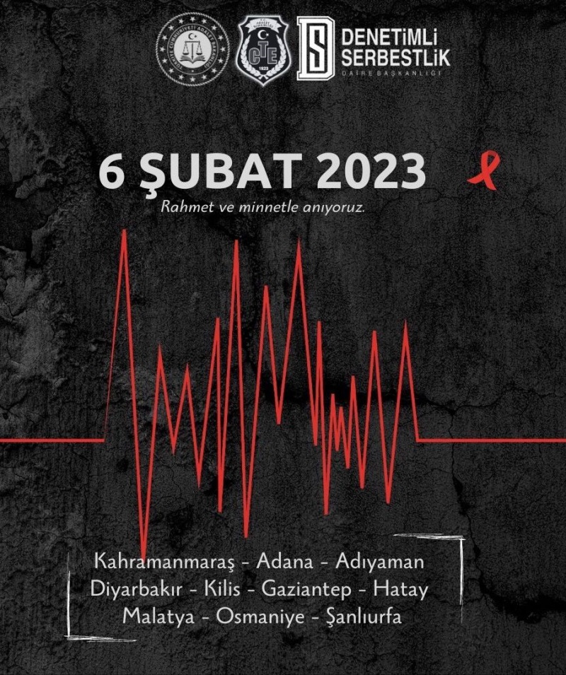 Çarşamba Denetimli Serbestlik Müdürlüğü olarak, 6 Şubat 2023 tarihinde Kahramanmaraş merkezli olarak meydana gelen ve birçok ili etkileyen depremlerde hayatını kaybeden vatandaşları rahmetle anıyoruz.